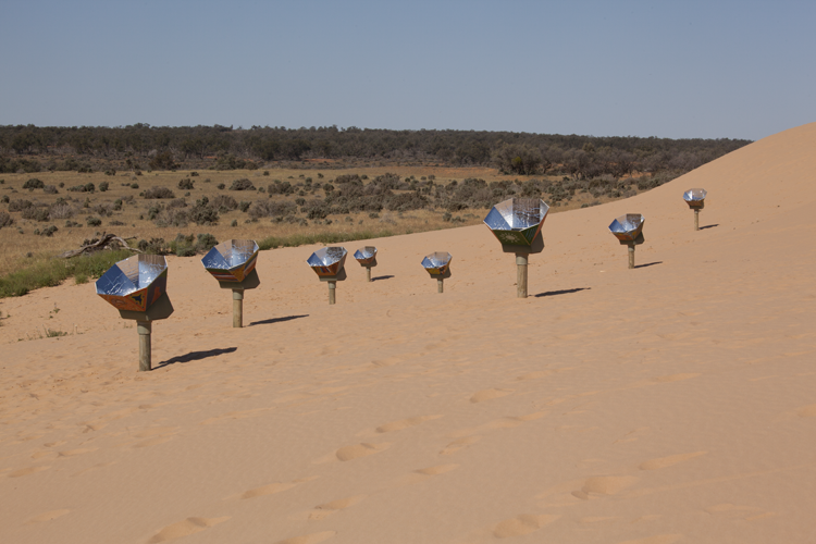 Yutaka Kobayashi, The World's First Baker, 2014-2015 Willandra Lakes Region World Heritage Area / Mungo National Park Mildura Palimpsest Biennale #10, 2015 Collaboration with Mungo Youth Project, local schools and students. Solar ovens installed at Mungo National Park, baking bread made from Native Millet. Cardboard, silver foil, glass, timber, native plants and mixed media. Dimensions variable. |