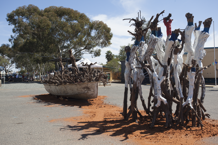 Keven Kozaei, Untitled, 2015 Mildura Palimpsest Biennale #10, 2015, Sunraysia Mallee Ethnic Communities Council Wooden boat, Mallee branches, paint, earth. Dimensions variable. |