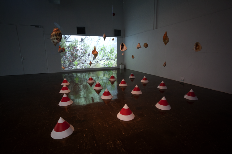 Julie Gough, Holding Pattern, 2015 Unmapping the End of the World, Mildura Palimpsest Biennale #10, 2015 HDMI video projection, H.264, 16:9, colour, sound, 15:39min. Edited by Jeff Blake. Installation: sea shells, enamel on zinc, video projection. Dimensions variable. |