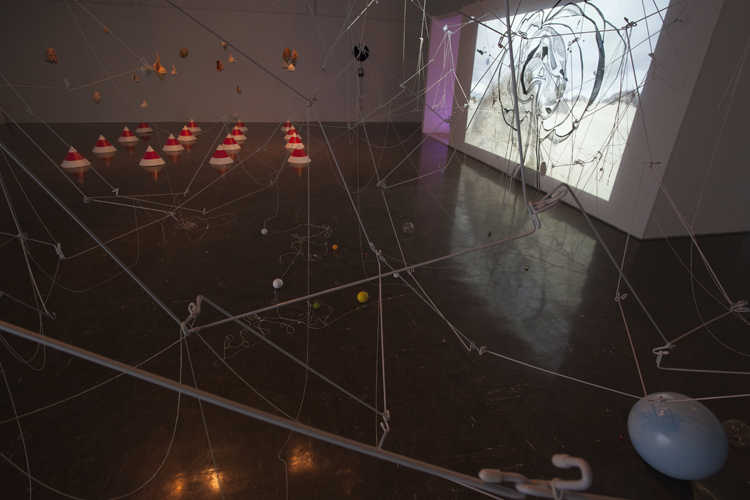 Koji Ryui & Jonathan Kimberley, Untitled Drawing (for Unmapping the End of the World) & Axis Mungo | Mungo Labyrinth, 2015 Unmapping the End of the World, Mildura Palimpsest Biennale #10, 2015 Installation, video projection, wall drawing, poly-coated wires, string, found objects. Dimensions variable. |